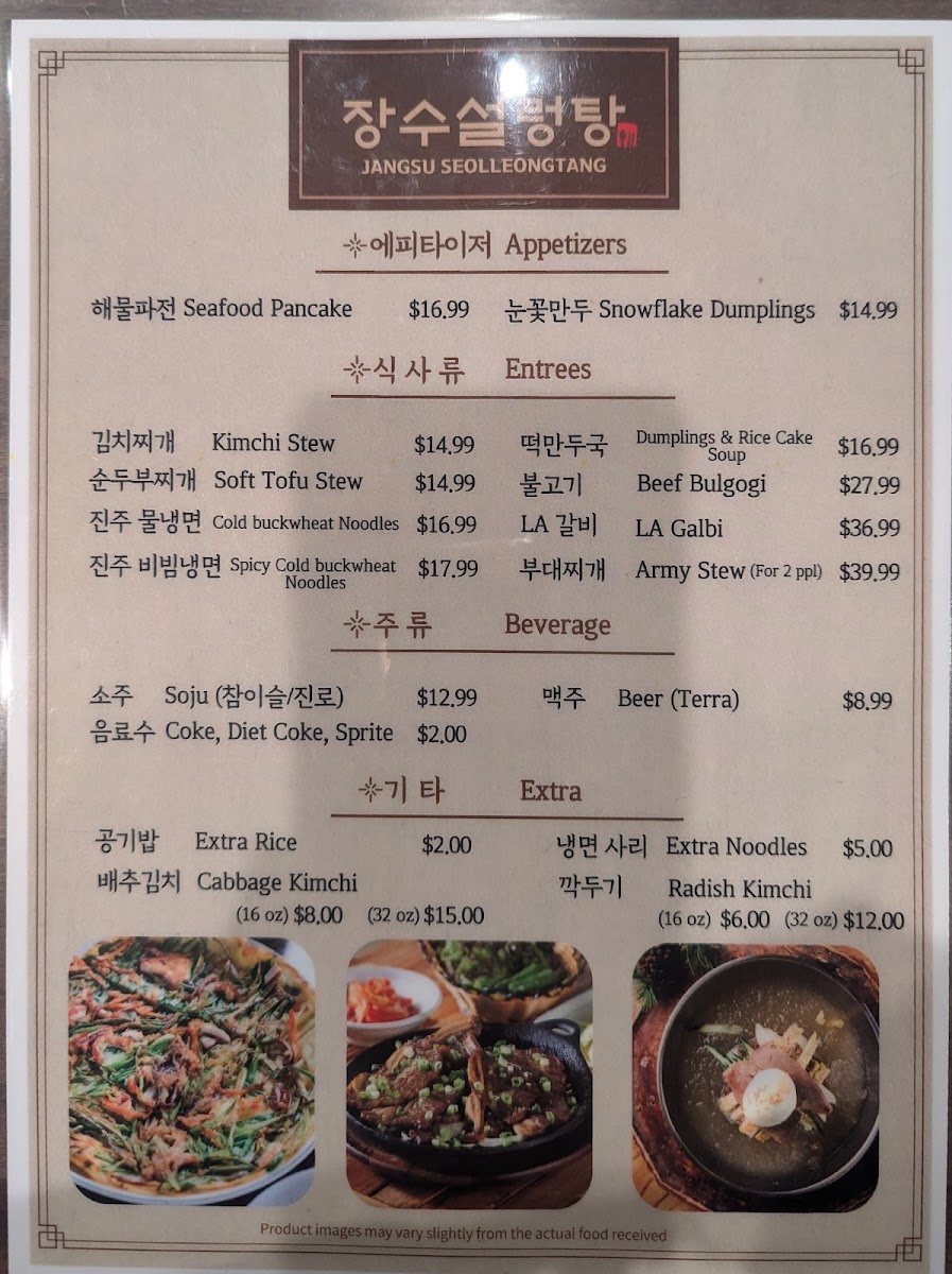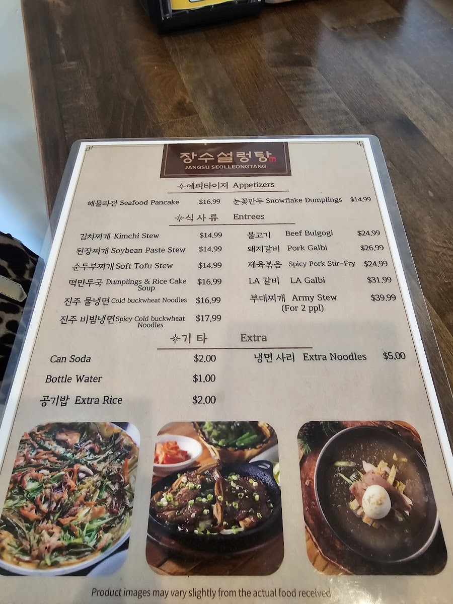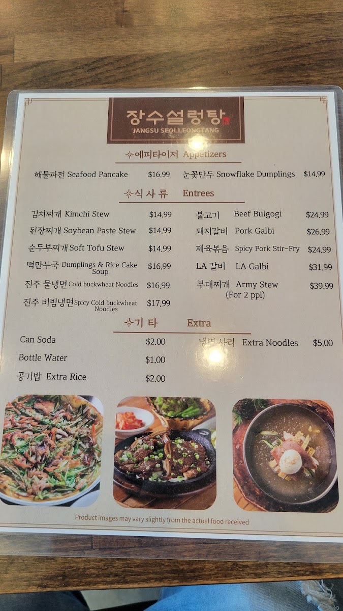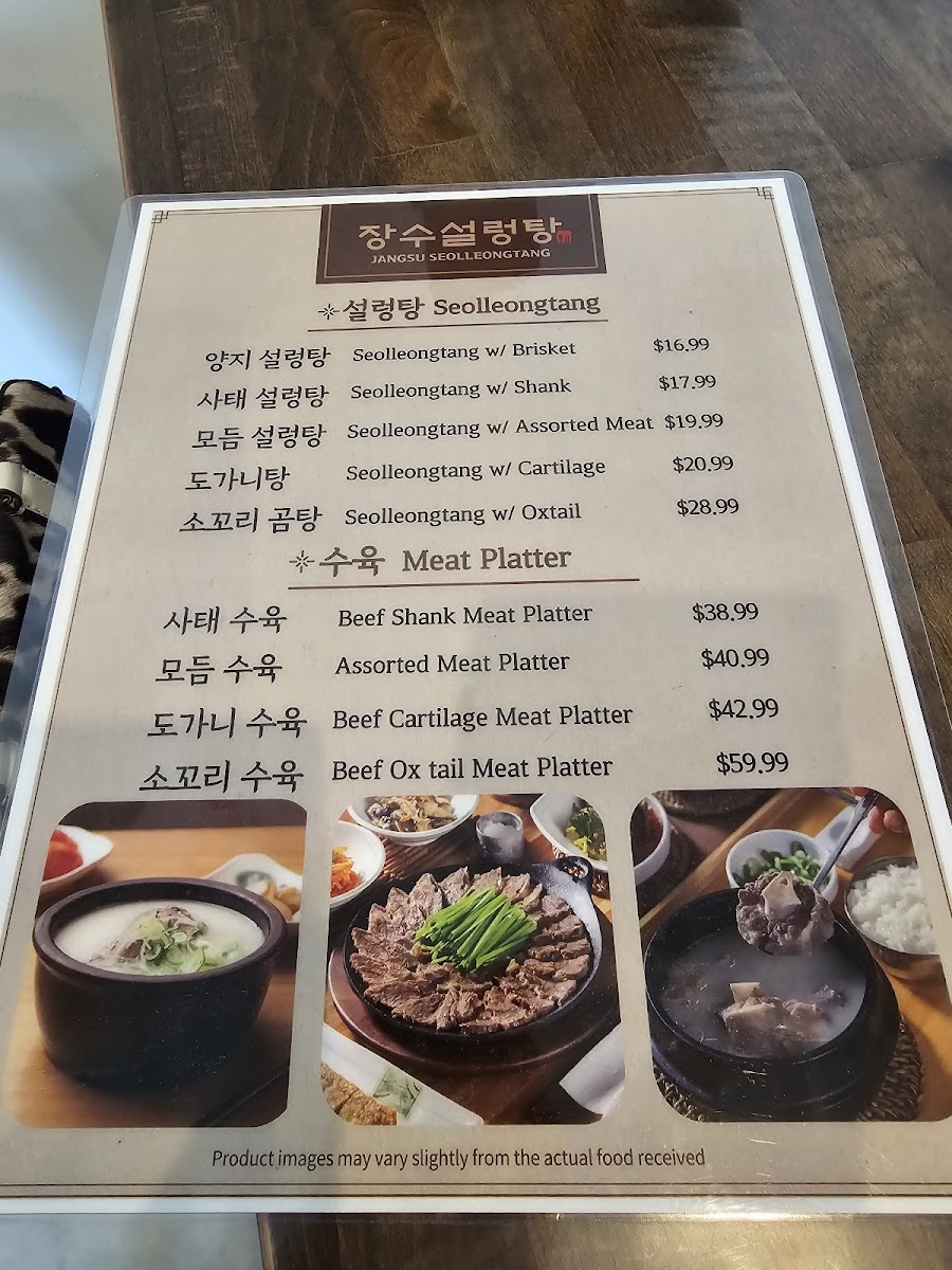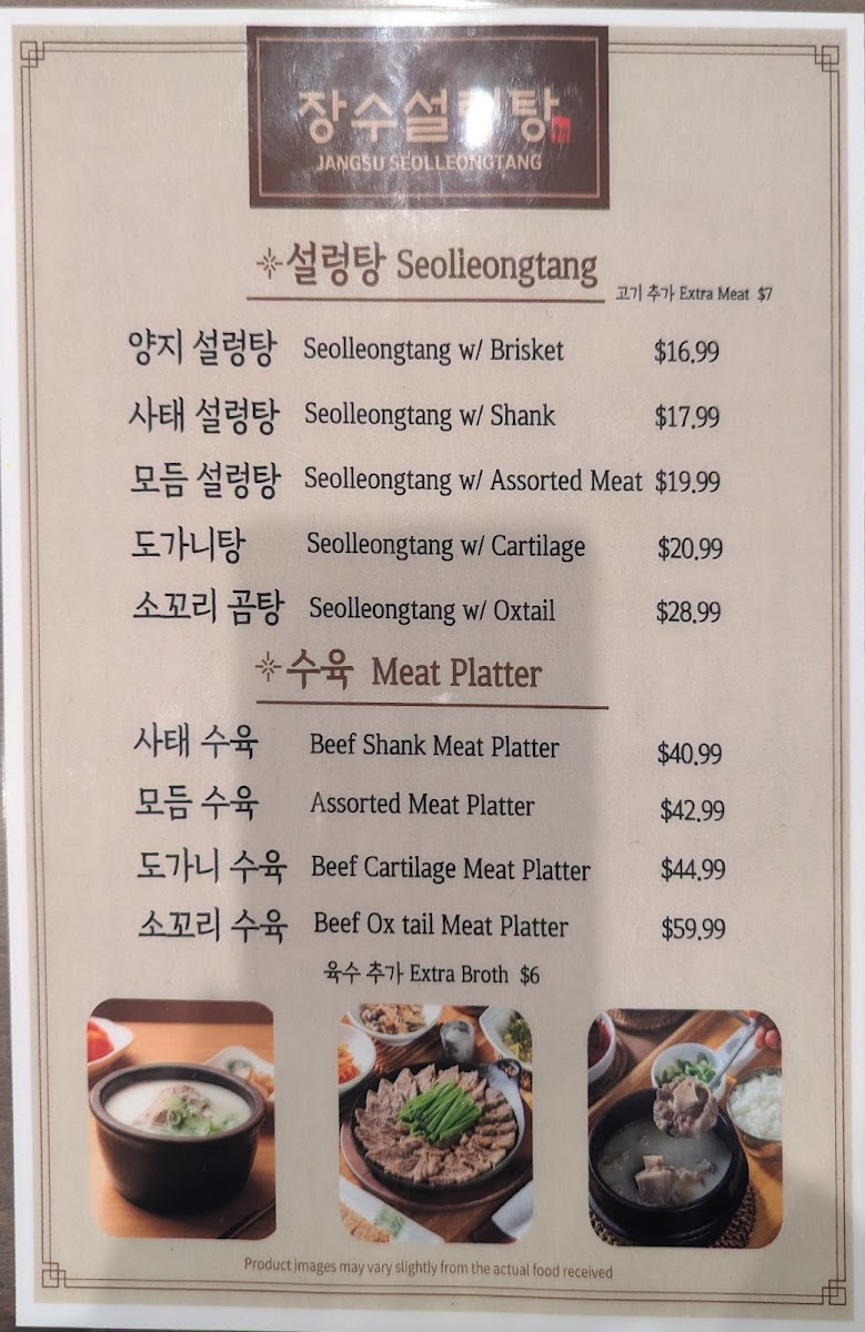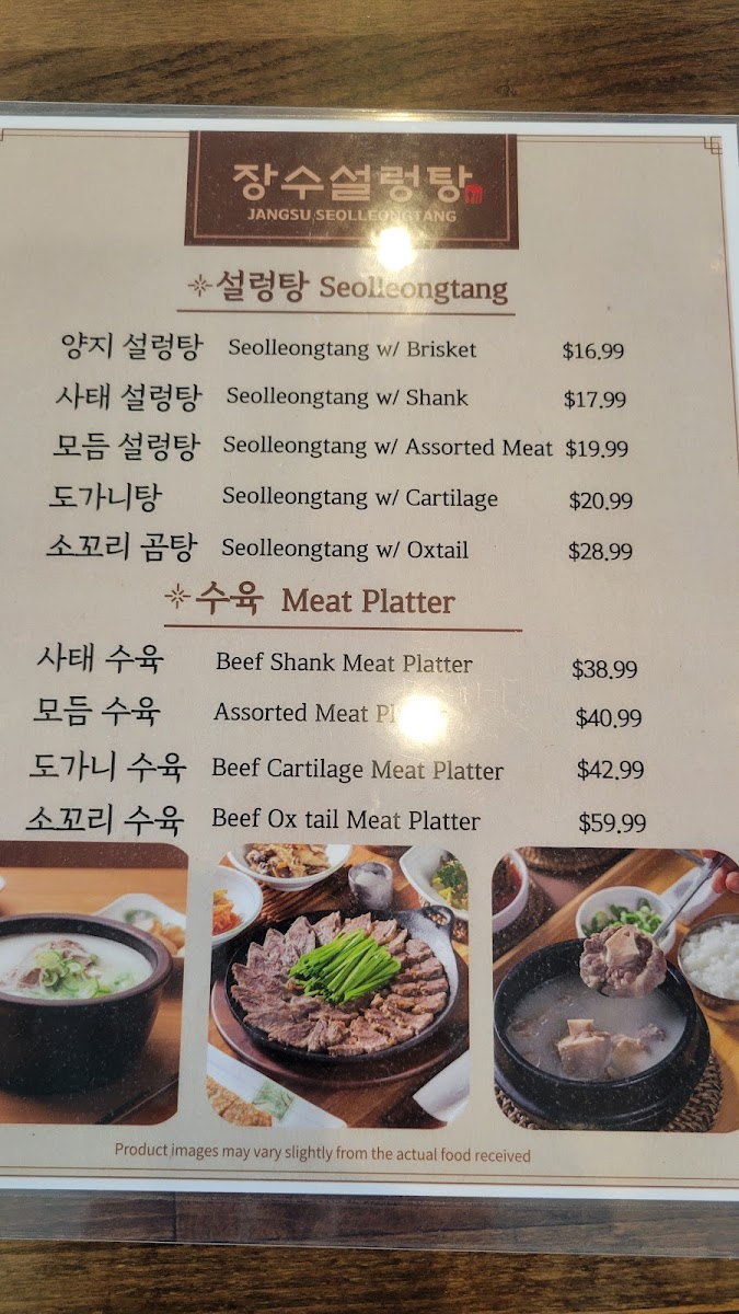 Jangsu Seolleongtang offers a diverse and satisfying menu, with a focus on traditional Korean dishes. The restaurant’s signature offering, Seolleongtang (a rich, hearty oxtail soup), comes in various options to cater to different tastes. The 양지설렁탕 (Seolleongtang with Brisket) and 사태 설렁탕 (Seolleongtang with Shank) are popular choices, with each bowl offering a warm and comforting broth, perfect for cold weather. For those who prefer a more varied dish, the Seolleongtang With Assorted Meat provides a delightful mix, combining beef brisket, shank, and oxtail for a full-bodied flavor.